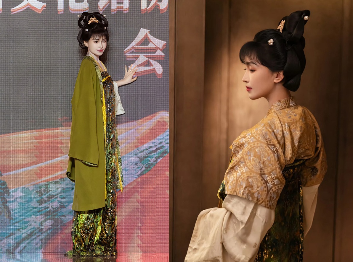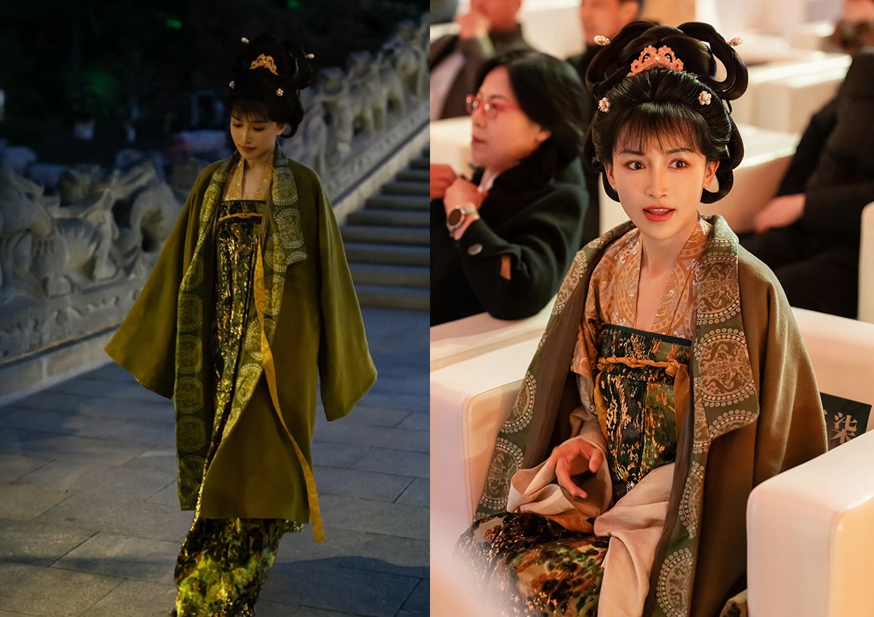 Người đẹp Tứ Xuyên Lý Tử Thất được khen vẻ cổ điển khi mặc trang phục thời Đường, tạo kiểu tóc hình bông hoa.